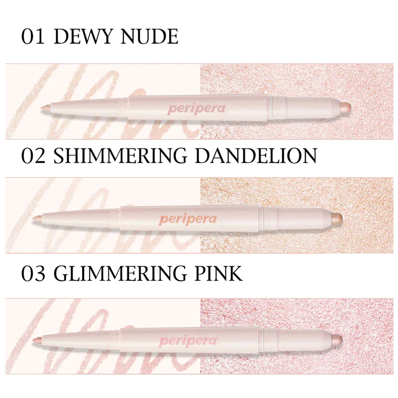 PERIPERA Sugar Twinkle Duo Eye Stick is a stick-type duo shadow that brings a sparkle to your eyes. The dual-sided eye shadow stick is composed of a brightener that creates a velvet glow that naturally blends with your skin's tone. The other end provides you with transparent shimmer pearls that smoothen the area under your eye, also known as "aegyo sal". Create a cute and charismatic makeup look that leaves a long-lasting matte finish to look like a K-Pop idol.